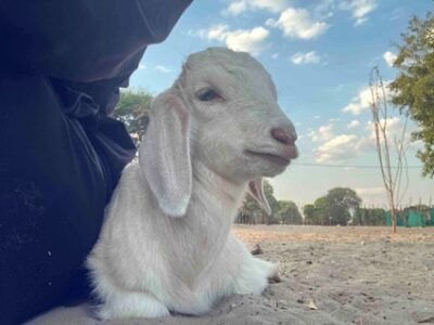 (写真1):仔山羊と私(2025年10月12日、ボツワナで執筆者撮影)